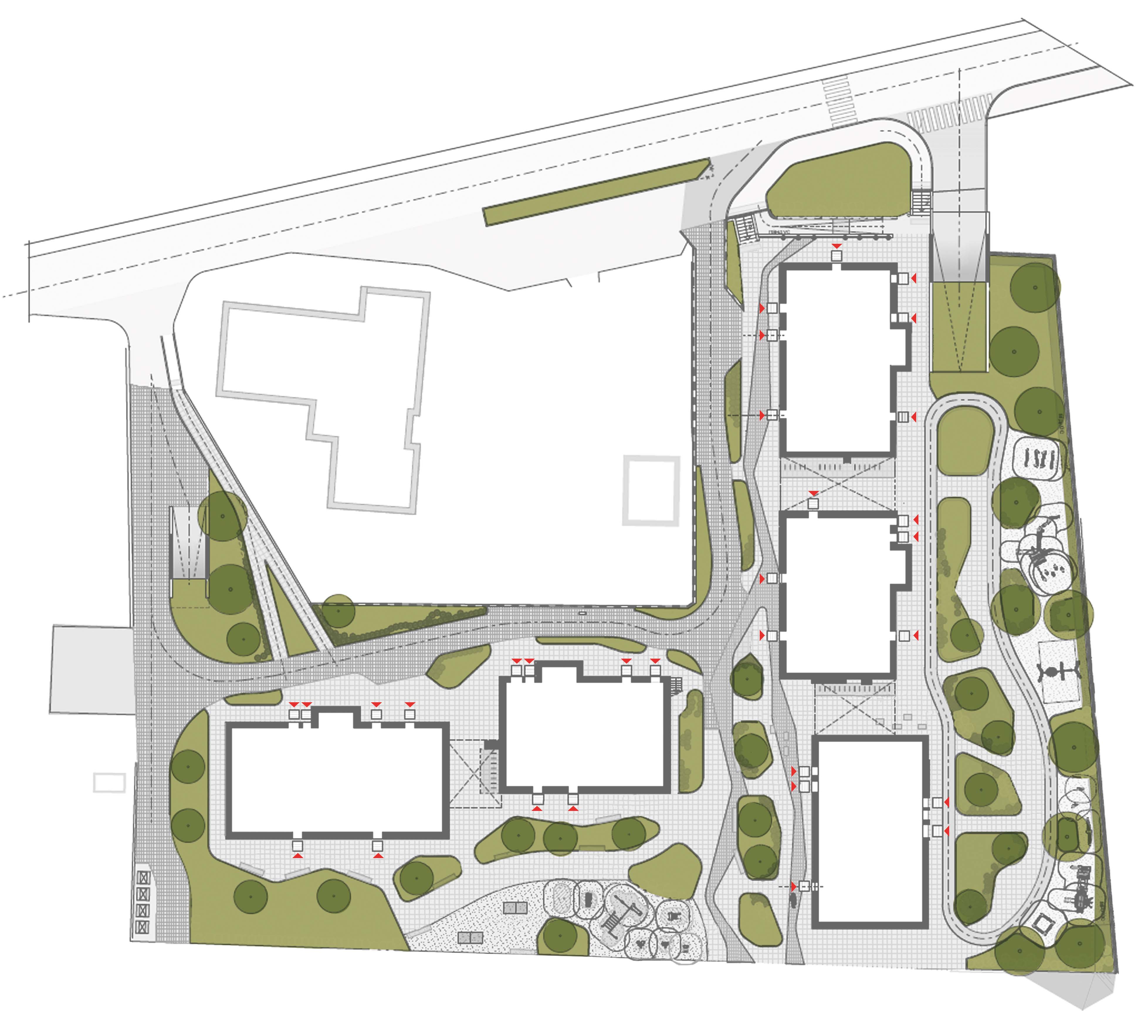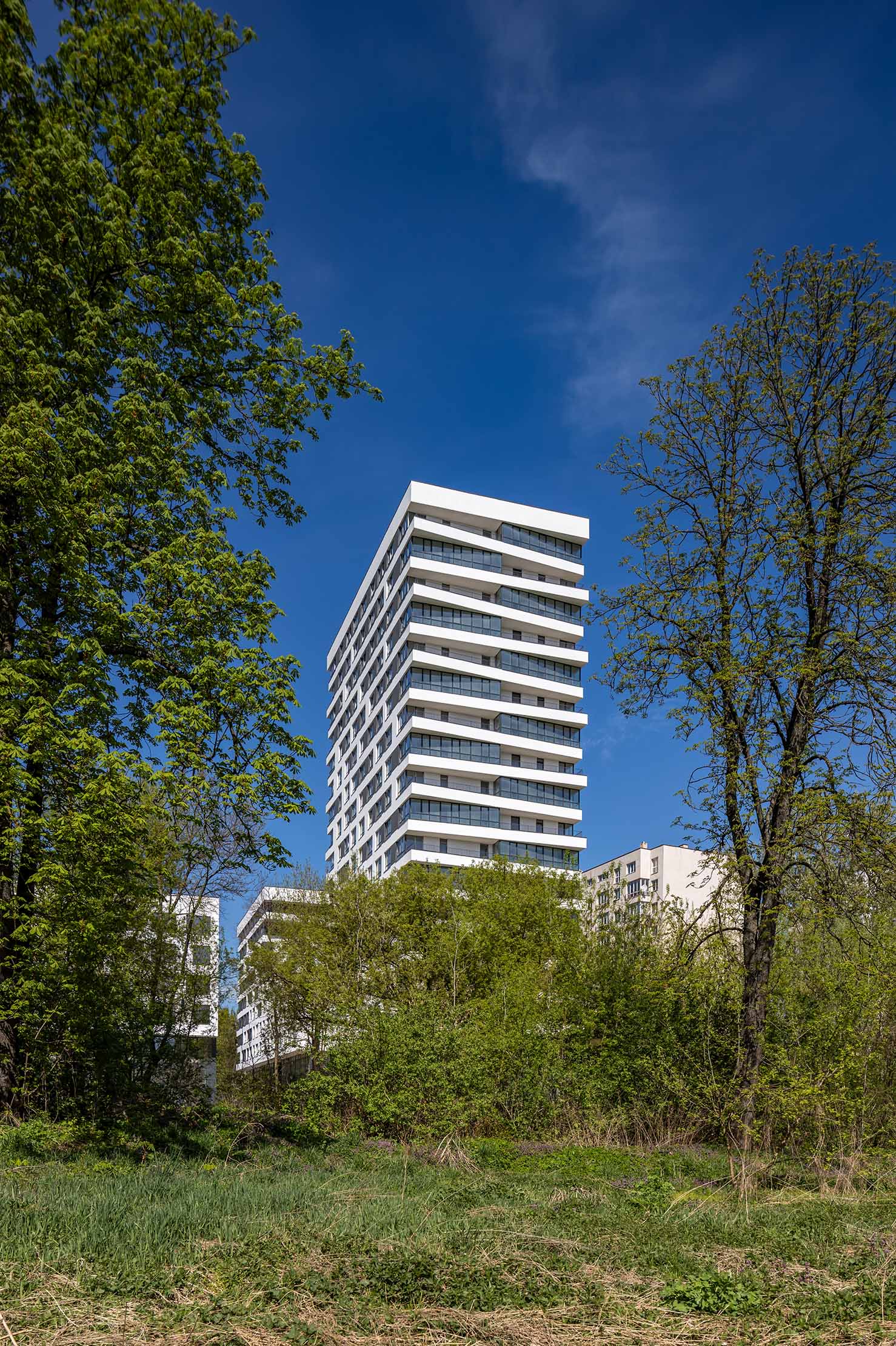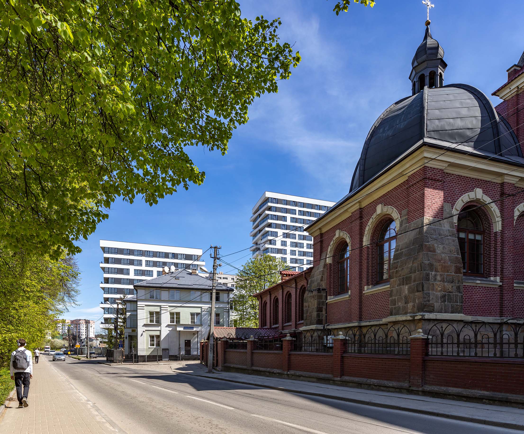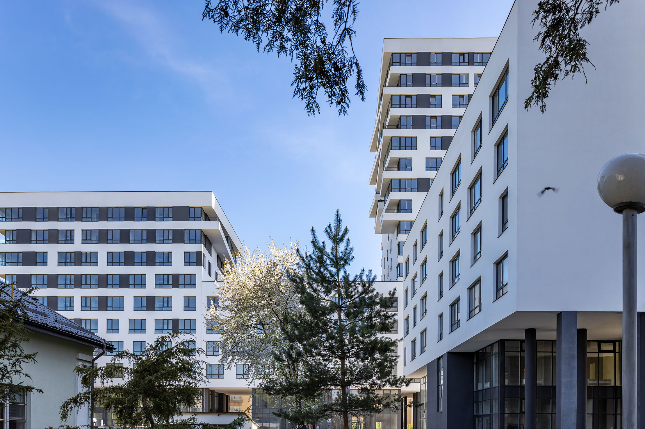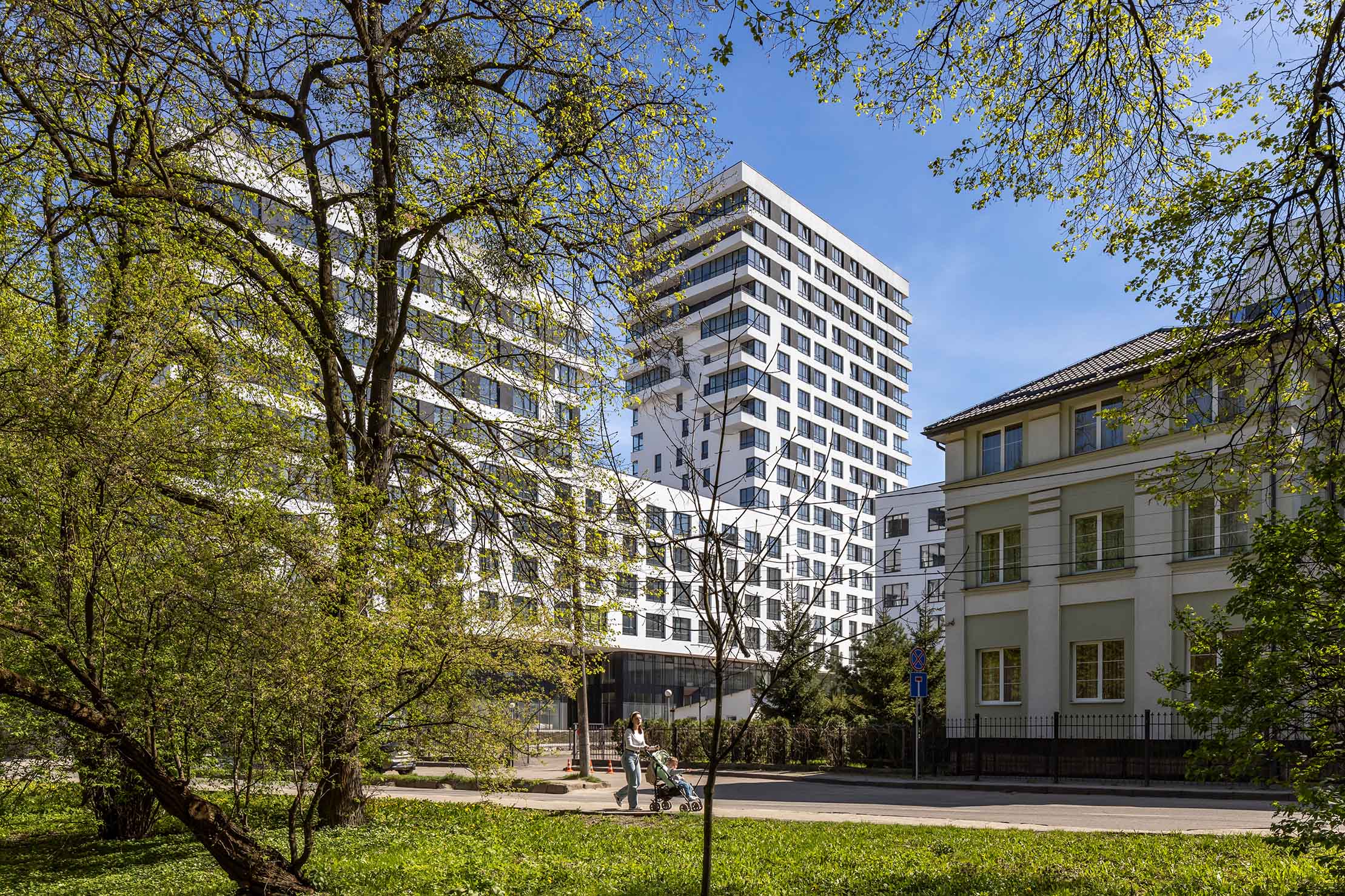 Враховуючи особливості ділянки, архітектори вирішили згрупувати секції в два блоки різної поверховості. 11-поверхівка зі сторони вул. Авраама Лінкольна продовжувала тему формування забудови вулиці. Зі сторони церкви Св.Йосафата також 11 поверхів і у найвіддаленішому куті – 18-поверхівка.